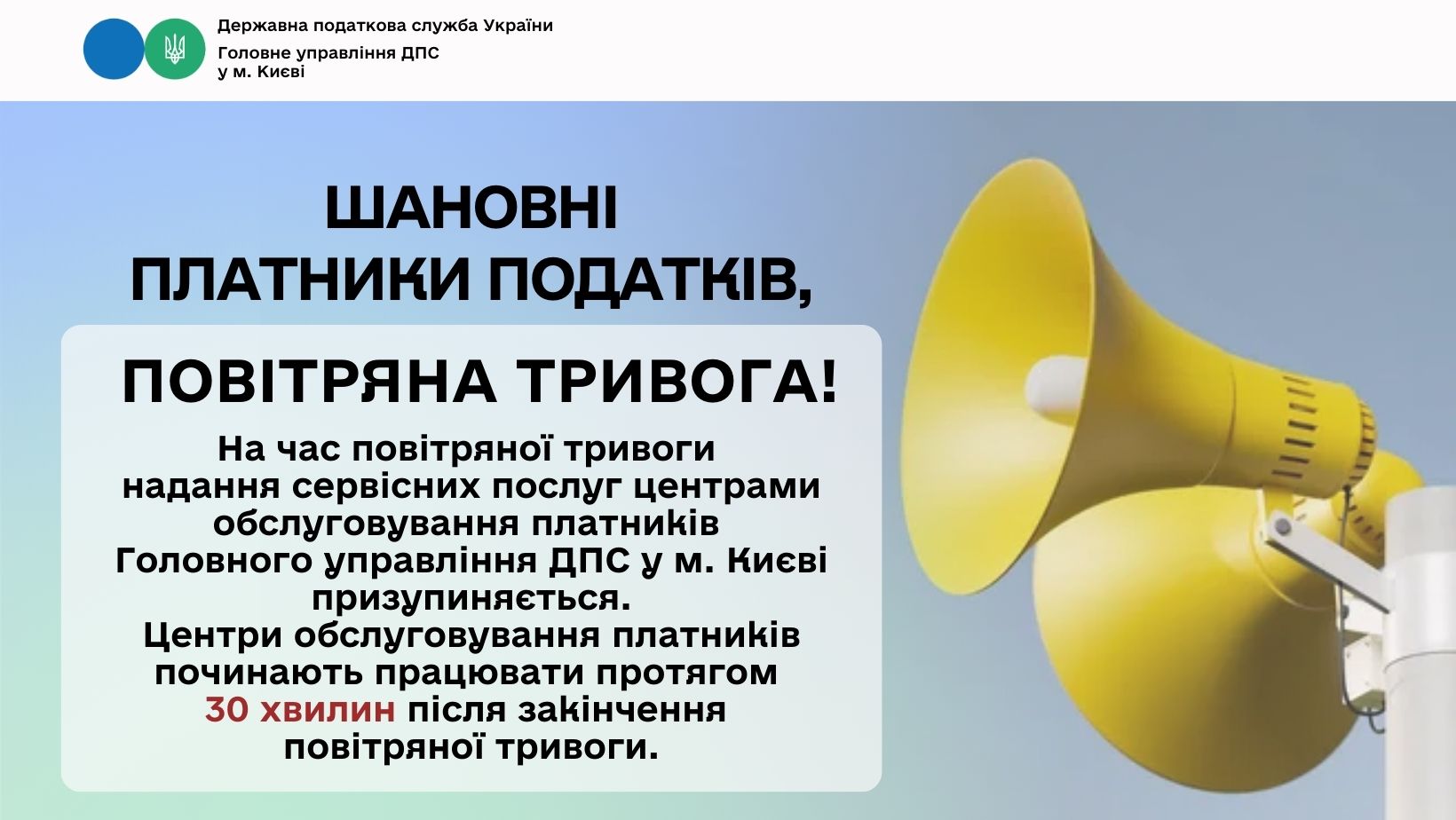 На час повітряної тривоги надання сервісних послуг центрами обслуговування платників Головного управління ДПС у м. Києві призупиняється.