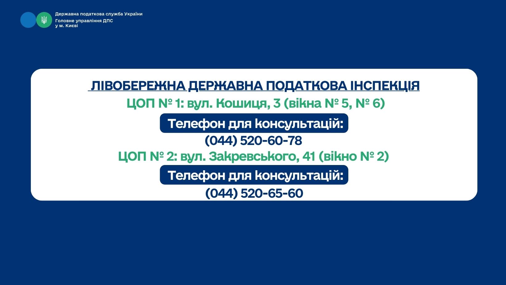 Консультації надаються в Центрах обслуговування платників Головного управління ДПС у м. Києві: