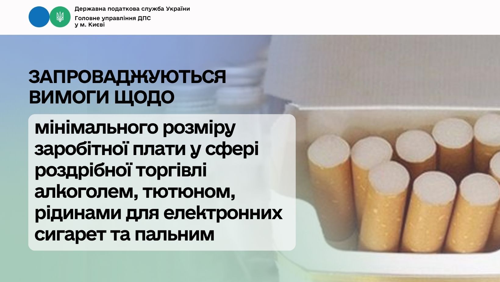 Головне управління ДПС у м. Києві інформує, що для суб’єктів господарювання, які вроздріб торгують алкогольними напоями, тютюновими виробами, рідинами для електронних сигарет та пальним, з 01 жовтня 2025 року запроваджено вимоги щодо мінімального розміру середньої щомісячної заробітної плати або загального місячного оподатковуваного доходу.