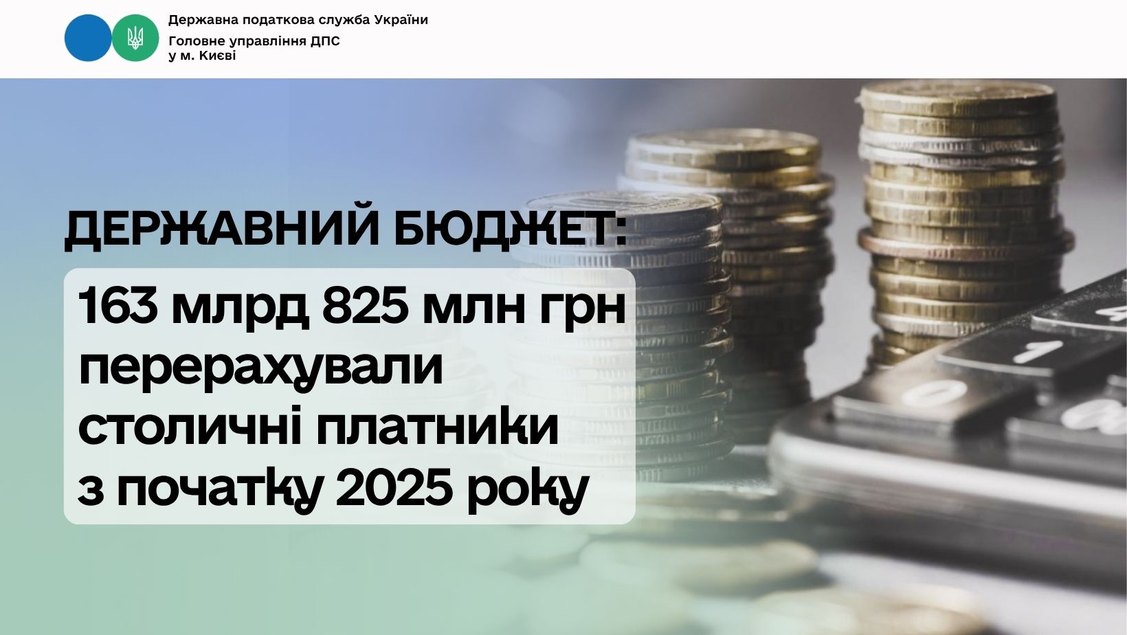 Державний бюджет: 163 млрд 825 млн грн перерахували столичні платники з початку 2025 року