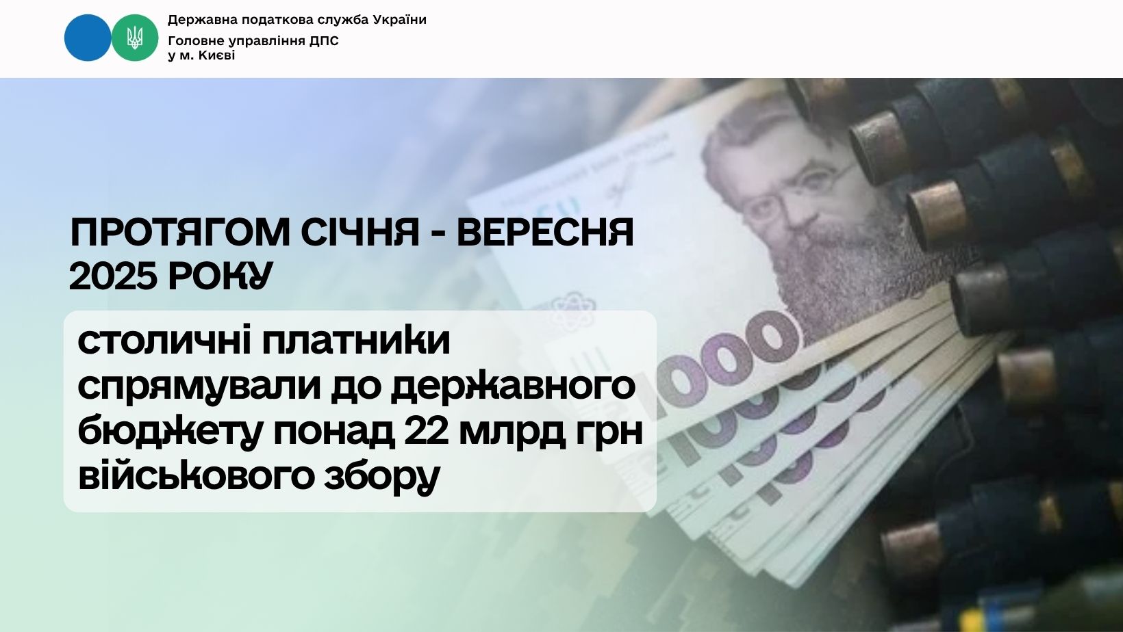 За період січень – вересень 2025 року платники податків м. Києва сплатили до державного бюджету 22 млрд 45 млн грн військового збору. Надходження військового збору збільшилися на 15 млрд 600 млн грн порівняно з січнем – вереснем 2024 року. Таким чином, сума збору перевищила торішній показник у 3,4 раза.