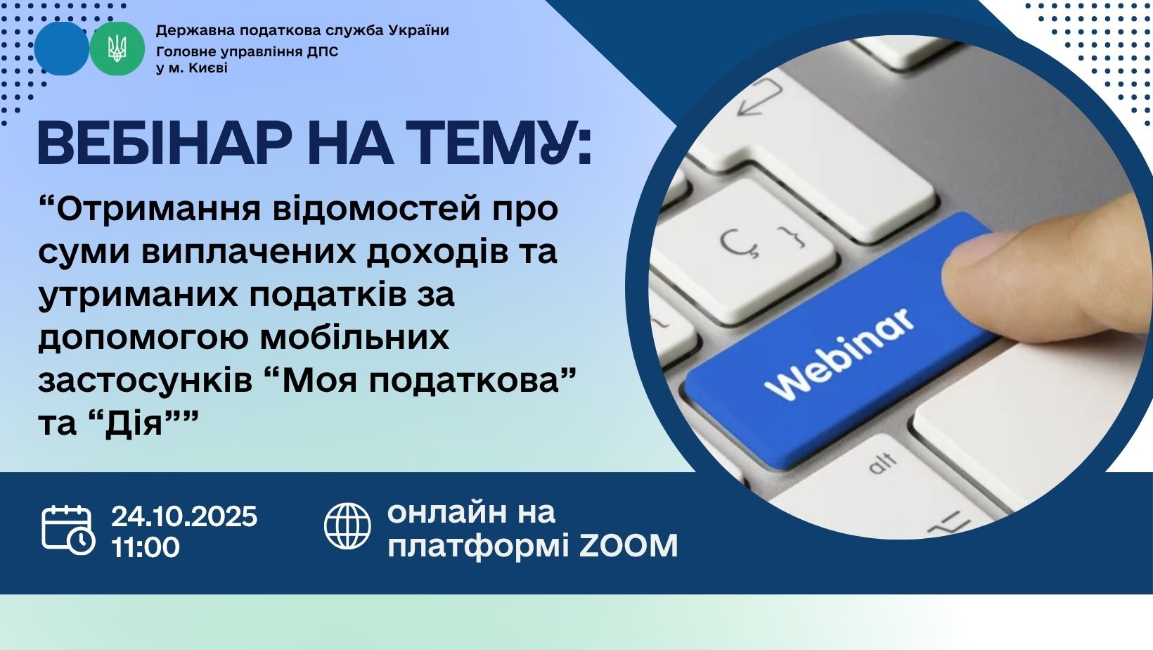 Увага! 24 жовтня 2025 року відбудеться вебінар для столичних платників податків на тему: «Отримання відомостей про суми виплачених доходів та утриманих податків за допомогою мобільних застосунків «Моя податкова» та «Дія»»