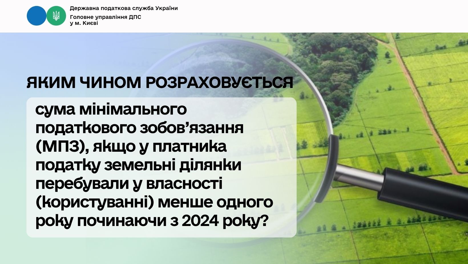 Головне управління ДПС у м. Києві повідомляє, що підпунктом 14.1.1142 пункту 14.1 статті 14 Податкового кодексу України (далі – ПКУ) визначено, що мінімальне податкове зобов'язання – це мінімальна величина податкового зобов'язання із сплати податків, зборів, платежів, контроль за справлянням яких покладено на контролюючі органи, пов'язаних з виробництвом та реалізацією власної сільськогосподарської продукції та/або з власністю та/або користуванням (орендою, суборендою, емфітевзисом, постійним користуванням) земельними ділянками, віднесеними до сільськогосподарських угідь, розрахована відповідно до ПКУ . Сума мінімальних податкових зобов'язань, визначених щодо кожної із земельних ділянок, право користування якими належить одній юридичній або фізичній особі, у тому числі фізичній особі – підприємцю, є загальним мінімальним податковим зобов'язанням.