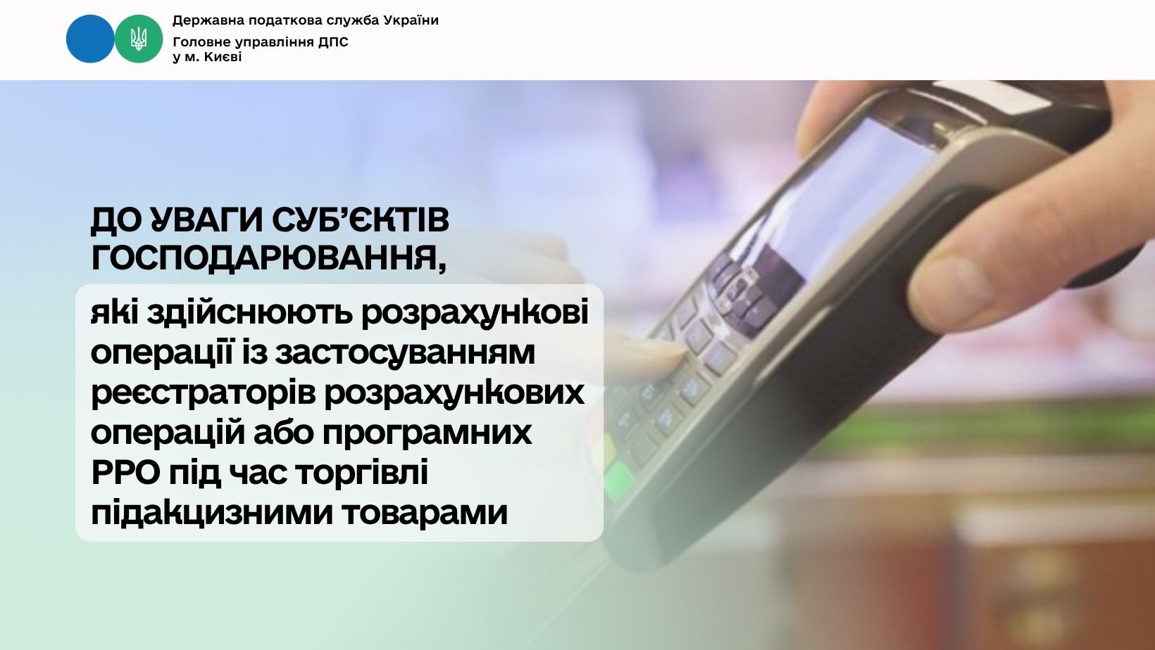 У зв’язку із наведеним вище інформуємо суб’єктів господарювання, які здійснюють розрахункові операції із застосуванням РРО/ПРРО про необхідність дотримання вимог пункту 11 статті 3 Закону України від 06.07.1995 № 265/95-ВР «Про застосування реєстраторів розрахункових операцій у сфері торгівлі, громадського харчування та послуг» (далі – Закон № 265) під час торгівлі підакцизними товарами.