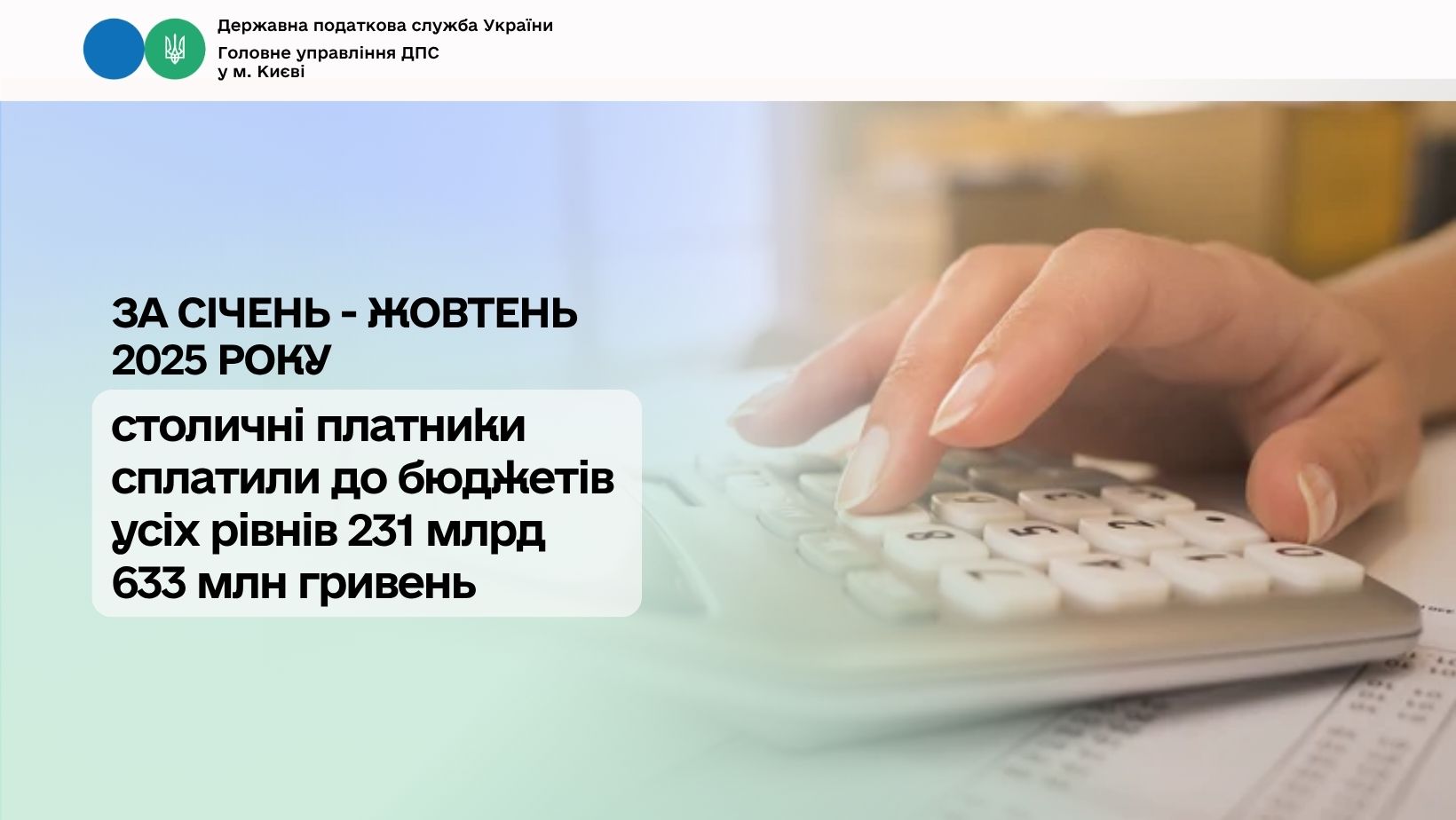 За 10 місяців 2025 року до бюджетів усіх рівнів платники податків Києва сплатили 231 млрд 633 млн гривень. Порівняно з аналогічним періодом минулого року надходження зросли на 24 %, додатково надійшло 44 млрд 890 млн гривень.