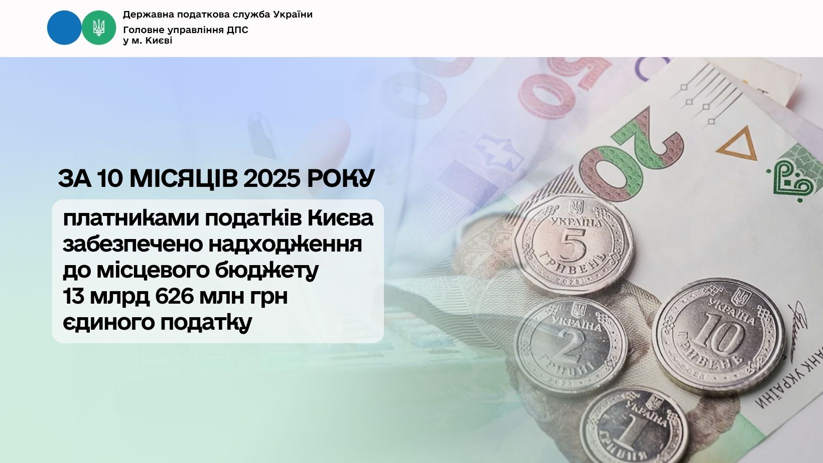 За 10 місяців 2025 року платниками податків Києва забезпечено надходження до місцевого бюджету 13 млрд 626 млн грн єдиного податку