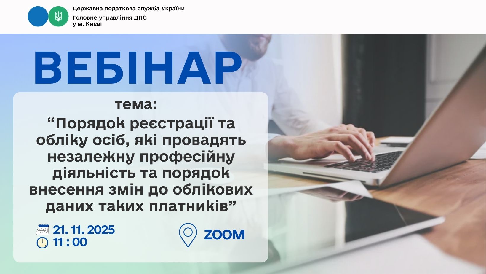 Увага! 21 листопада 2025 року відбудеться вебінар для столичних платників податків на тему: «Порядок реєстрації та обліку осіб, які провадять незалежну професійну діяльність та порядок внесення змін до облікових даних таких платників»