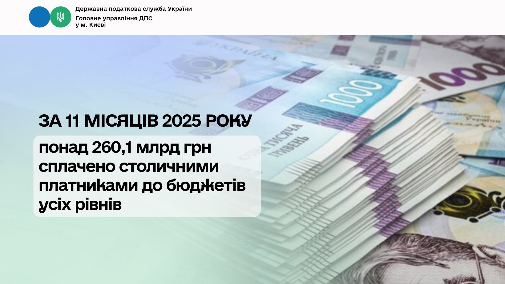 Начальник податкової служби столиці Інна Якушко повідомила, що упродовж січня – листопада поточного року до бюджетів усіх рівнів столичними платниками податків спрямовано 260 млрд 157 млн гривень. Порівняно з аналогічним періодом 2024 року надходження збільшилися на 24 %, або на 49 млрд 457 млн гривень.