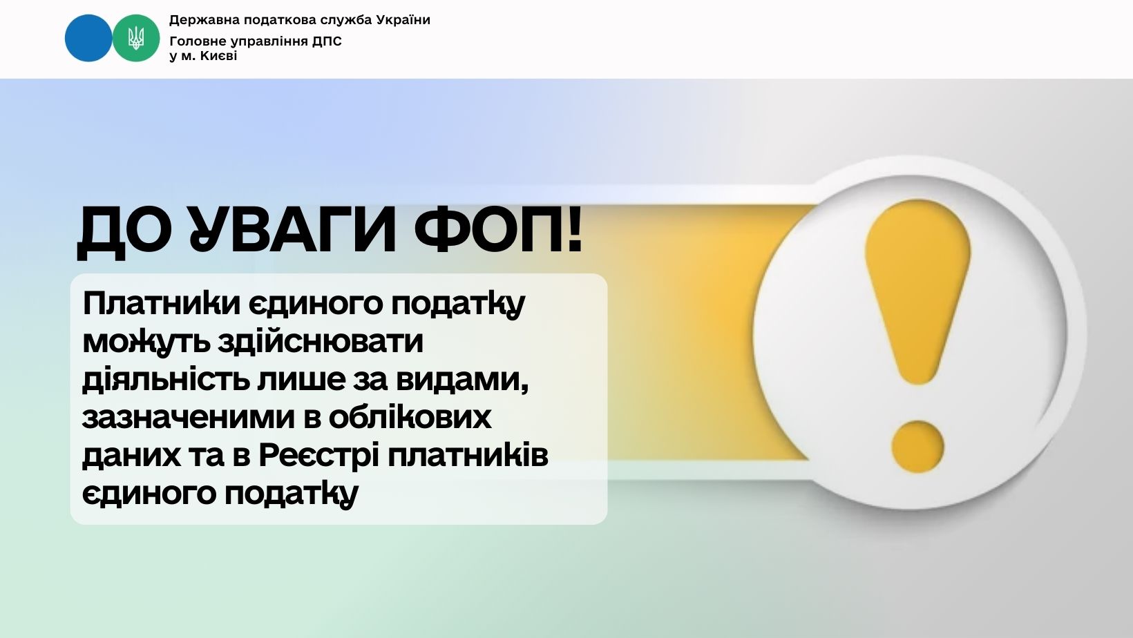 Головне управління ДПС у м. Києві звертає увагу, що фізичні особи – підприємці, які перебувають на спрощеній системі оподаткування, не мають права здійснювати види господарської діяльності, не внесені до їхніх облікових даних та які відсутні у реєстрі платників єдиного податку.