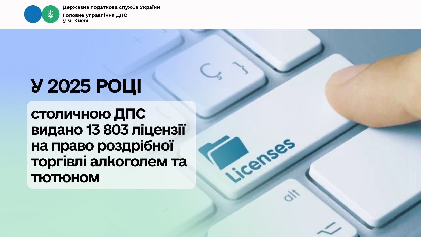 Протягом 2025 року фахівцями Головного управління ДПС у м. Києві видано суб’єктам господарювання столиці 13 803 ліцензії на право роздрібної торгівлі алкогольними напоями та на право роздрібної торгівлі тютюновими виробами. Так, на роздрібний продаж алкогольних напоїв видано – 8 489 ліцензій; на роздрібний продаж тютюнових виробів – 5 314 ліцензій.