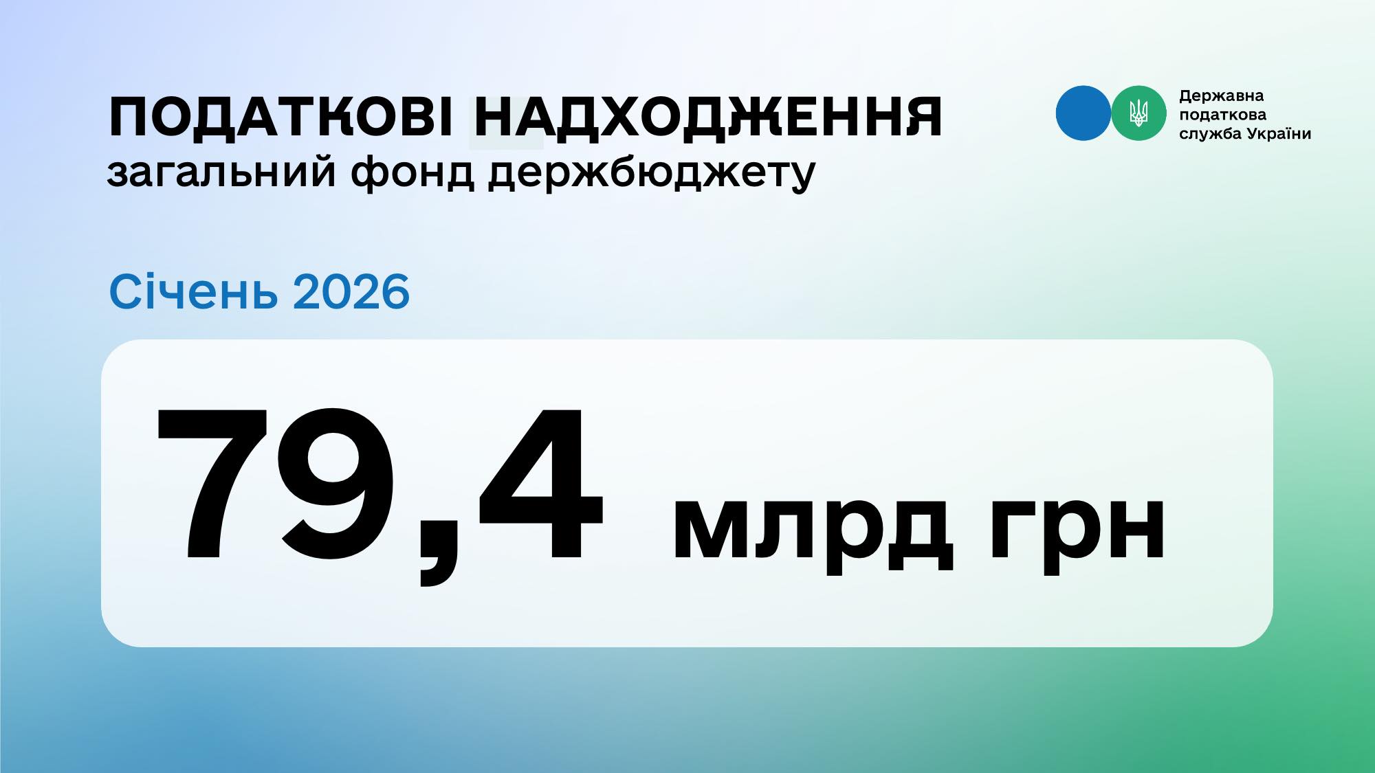 До загального фонду держбюджету у січні 2026 року  надійшло 79,4 млрд грн (91,8 % плану) податків та зборів, які контролює ДПС. Про це на своїй сторінці у Facebook повідомила в. о. Голови ДПС Леся Карнаух.