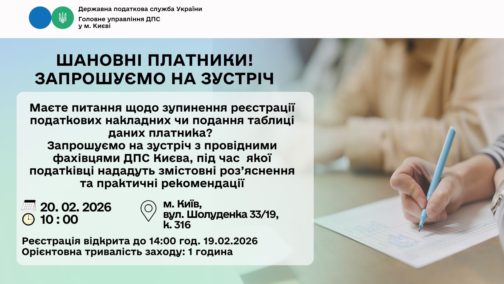 Маєте запитання щодо зупинення реєстрації податкових накладних чи подання таблиці даних платника? Запрошуємо на зустріч з провідними фахівцями ДПС Києва, під час якої податківці нададуть змістовні роз’яснення та практичні рекомендації.