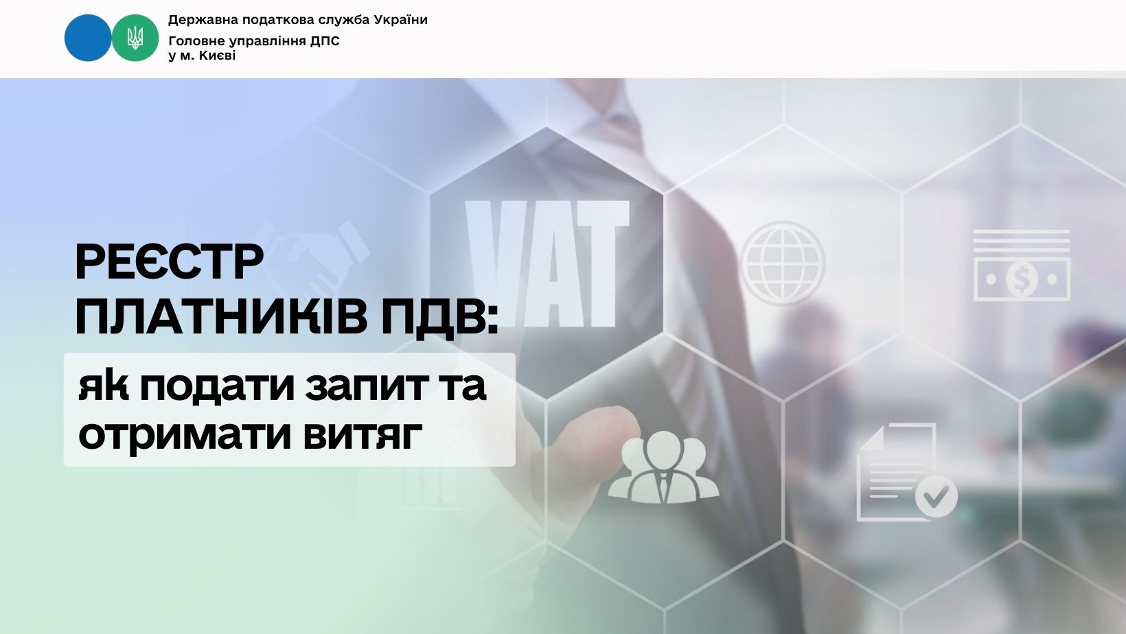 Головне управління ДПС у м. Києві інформує, що за запитом платника ПДВ контролюючий орган безоплатно та безумовно надає витяг з реєстру платників податку на додану вартість (далі – Реєстр) протягом двох робочих днів, що настають за днем отримання такого запиту. Витяг діє до внесення змін до Реєстру.