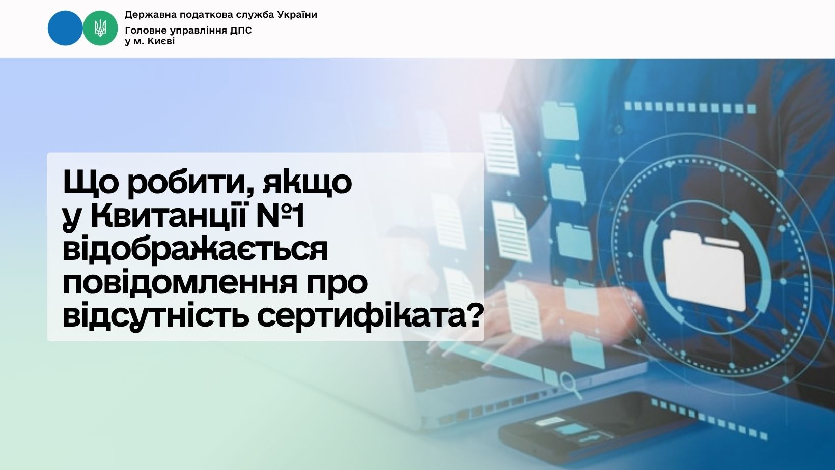 Головне управління ДПС у м. Києві інформує, що у Квитанції № 1 може з’явитися повідомлення про відсутність електронного сертифіката в реєстрі зареєстрованих сертифікатів. Водночас у системі електронного документообігу може бути наявний «Перший документ», що містить дату, номер реєстрації та реквізити сертифіката, яким його було підписано.