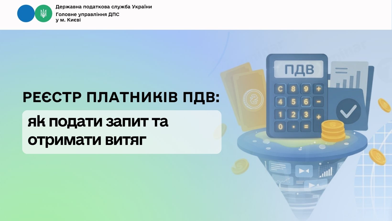Головне управління ДПС у м. Києві інформує, що за запитом платника ПДВ контролюючий орган безоплатно та безумовно надає витяг з реєстру платників податку на додану вартість (далі – Реєстр) протягом двох робочих днів, що настають за днем отримання запиту. Витяг є чинним до внесення змін до Реєстру.