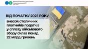 За 9 місяців 2025 року столичні платники податків спрямували до державного бюджету 22 млрд 45 млн грн військового збору.