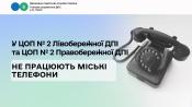 Повідомляємо, що у ЦОП № 2 Лівобережної ДПІ Головного управління ДПС у м. Києві, що знаходиться за адресою: вул. Закревського, 41 та ЦОП № 2 Правобережної ДПІ Головного управління ДПС у м. Києві, що знаходиться за адресою: вул. Політехнічна, буд. 5-А (вхід з пров. Політехнічного, буд. 5-А), у зв’язку з відсутністю електропостачання тимчасово не працюють міські телефони.