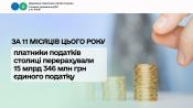 Упродовж січня – листопада 2025 року столичні платники сплатили 15 млрд 346 млн грн єдиного податку. Як повідомила начальник ДПС Києва Інна Якушко, порівняно з січнем – листопадом минулого року надходження збільшилися на 1 млрд 176 млн грн, або на 8 %.