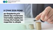 До бюджетів усіх рівнів у січні 2026 року надійшло 25 млрд 826 млн гривень. Порівняно з аналогічним періодом минулого року це більше на 9%, або на 2 млрд 34 млн гривень.