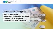 «За січень 2026 року платники податків сплатили до державного бюджету 20 млрд 739 млн гривень. Цей показник збільшився на 9 %, або на 1 млрд 646 млн гривень порівняно з січнем минулого року», – про це розповіла керівник ДПС у м. Києві Інна Якушко.