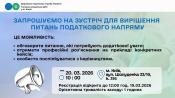 Водночас платники податків можуть з понеділка по п’ятницю звертатися до Офісу податкових консультантів та отримувати консультації у зручному форматі. Адреса: вул. Миколи Лєскова, 4.